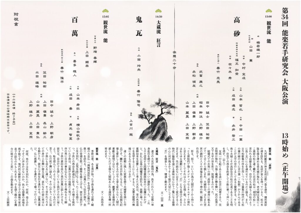 能楽(三役)研修修了者をはじめ、若手能楽師たちの研鑽の成果をご披露するため、能楽若手研究会大阪公演(大阪若手能)を開催いたします。